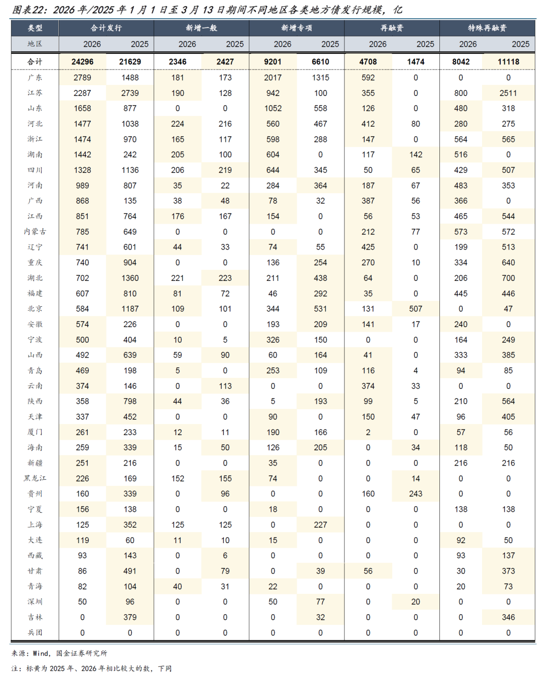 今年以来地方债发行规模较去年同期高约2700亿。日度累计来看,2026年1月1日至3月13日地方债合计发行2.43万亿、较2025年1月1日至3月13日的2.16万亿略有上升,净融资规模分别为2.13万亿、2.03万亿;其中新增一般债、特殊再融资债累计发行规模分别为2346亿、8042亿,较2025年同期的2427亿、11118亿有所下降;而新增专项债、普通再融资债券的发行规模分别为9201亿、4708亿,明显高于2025年同期的6610亿、1474亿。