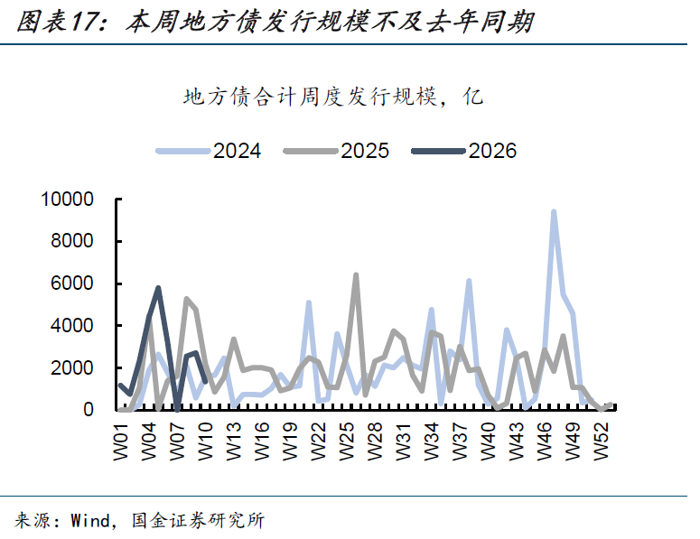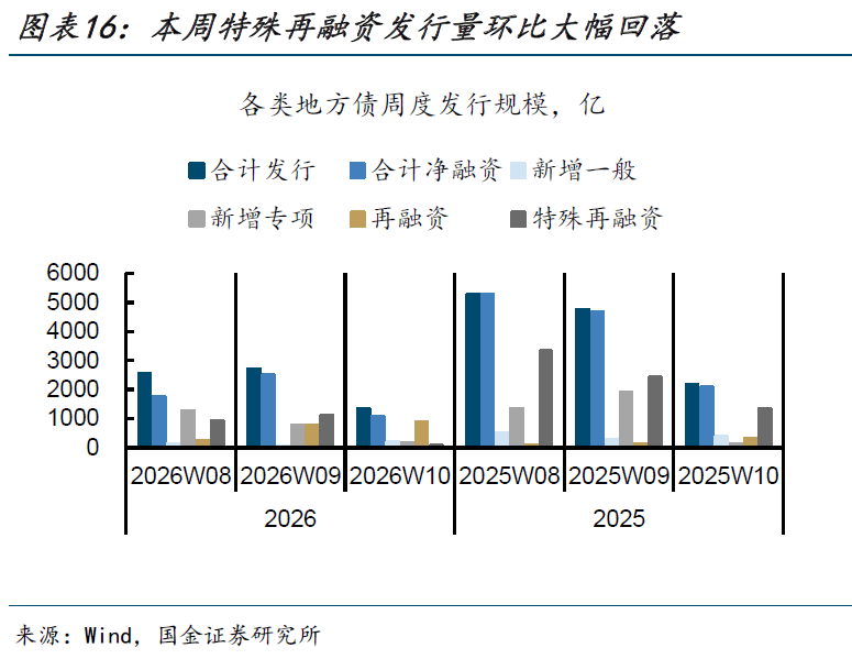 本周地方债净融资规模环比回落。周度来看,本周(2026/3/7-2026/3/13,2026W10,下同)地方债发行1355亿、净融资1081亿,较上周(2026/2/28-2026/3/6,2026W09,下同)2503亿的净融资规模回落。两周到期量相当,主要是本周发行规模回落1400亿左右;其中主要是特殊再融资发行规模大幅回落1000多亿至82亿,新增专项发行规模也回落600多亿至177亿,而新增一般债、普通再融资债发行规模略有上升。对比2025年同周,本周地方债发行规模和净融资规模均较2025年第十周(2025/2/29-2025/3/7,2025W10,下同)的2175、2080亿回落。