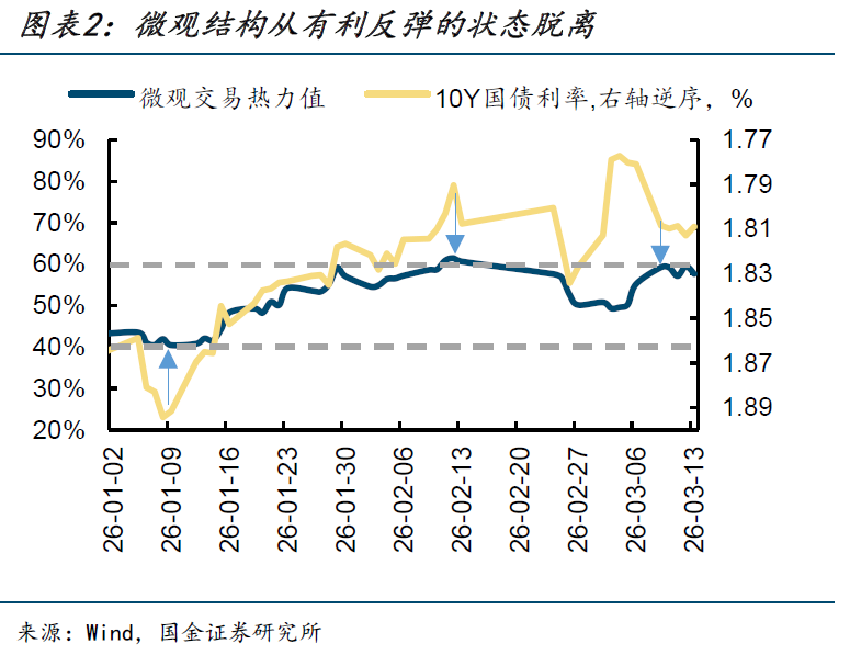 本周,宏观方面,国际油价剧烈波动,一度冲击120美元,使得市场对输入型通胀及其对PPI回升节奏的担忧明显升温;另一方面,出口数据表现超预期,企业中长贷磨底概率上升,基本面高频数据延续节后回暖态势,债市面临的基本面压力又有所浮现。微观方面,此前支撑利率反弹的部分微观交易结构也在边际上弱化:上周提示久期+分歧度利于反弹的“低久期+高分歧”状态已被破坏、交易盘在3月初一度出现拥挤性追涨的迹象,微观交易情绪指标也已回到55-60%之间的中等位置,脱离1月上旬40%附近有利于反弹的偏低区间。在宏观承压、微观结构不再利于反弹的背景下,本周债市出现陡峭化调整,10年国债利率重回1.8%上方。