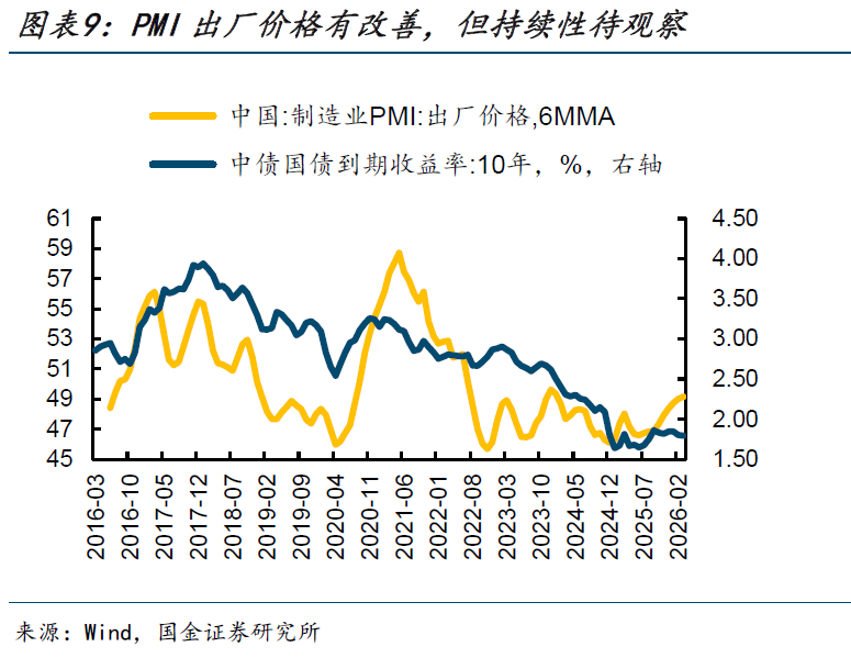 目前看来,当前价格回升主要集中在上游产业链,向中游出现了一定传导,对下游的传导尚处于早期阶段:一方面,耐用消费品与制造业出厂价格在1-2月均出现一定改善,说明上游成本压力已开始向下游边际渗透;但另一方面,出厂价格相对原材料价格回升幅度仍明显偏弱、耐用品价格的回升是否超出季节性仍待进一步确认,库存周期的改善也还局限在上游产业链,这意味着下游对涨价的承接能力仍有待进一步验证。也即,目前可以看到一些初步的传导启动迹象,但尚不足以确认是否会演化为普遍而持续的下游扩散,后续需保持观察。