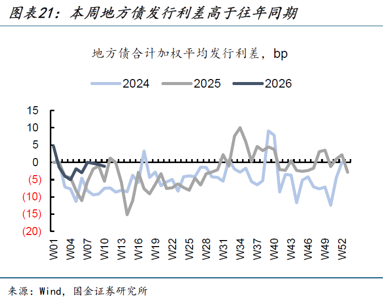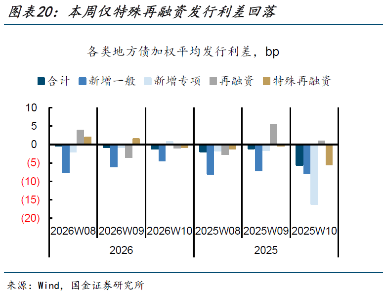 本周地方债发行利差持平上周。本周地方债发行利率与同期限二级地方债利差加权平均值为-1bp,环比持平。其中新增一般、新增专项、普通再融资的发行利差均上升2bp,仅特殊再融资债的发行利差下降2bp。同比2025年同周,总体发行利差较2025年第十周的-5bp上升。