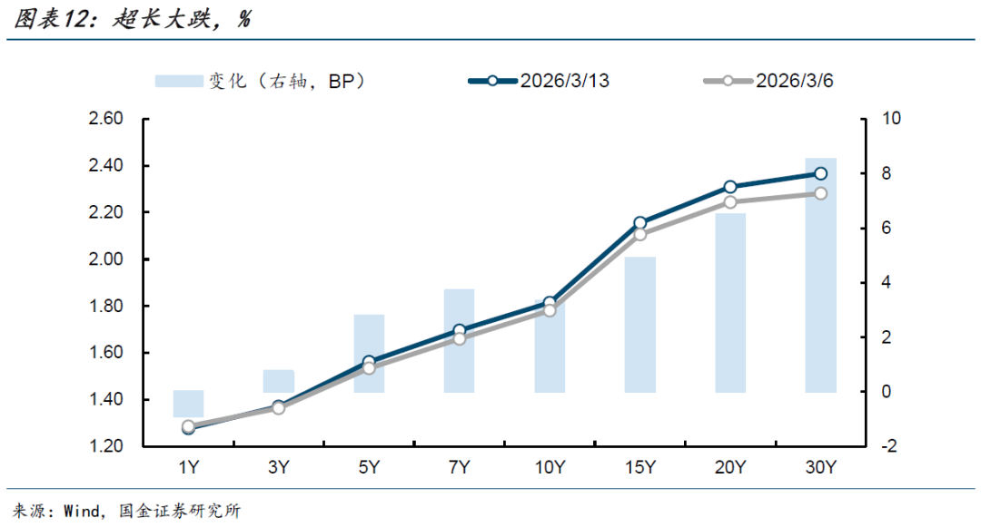 具体而言:周一(3月9日),今日统计局公布2月通胀数据,CPI跳升至至1.3%、PPI降幅收窄至-0.9%,数据超市场预期;叠加当日央行净回笼资金规模偏大,当日长端明显调整,10Y国债收益率上行2bp至1.81%、30Y国债收益率更是大幅上行5bp至2.33%。周二(3月10日),美国总统特朗普表示对伊朗的战事可能会“很快”会结束,油价小幅回落可能一定程度缓解市场通胀的担忧,昨日大跌后今日债市悲观情绪没有进一步发酵,10Y国债收益率持平于1.81%、30Y国债收益率小幅上行0.4bp至2.33%。周三(3月11日),海关总署公布1-2月进出口数据,2月单月出口同比增39.6%、进口增13.8%,大超市场预期,叠加当日权益走强,10Y国债收益率基本持平于1.81%、30Y国债收益率上行2bp至2.35%。周四(3月12日),今日消息较多,首先是伊朗方称“不会放弃复仇、将继续采取包括封锁霍尔木兹海峡在内的战略手段”,午后一则财联社新闻报道“部分成员银行参加市场利率定价自律机制会议,被要求加强自律管理,高于7天逆回购OMO政策利率(1.4%)的同业活期存款规模季度末占比不超过10%-20%”;晚间央行报道潘功胜行长主持召开经济金融专家座谈会,会议提到继续实施好适度宽松的货币政策,加大逆周期和跨周期调节力度。债市表现方面,可能市场预期同业存款流出后非银配债力度或加强,利好短债和同业存单,当日短端领涨,1Y国债收益率下行1bp至1.26%、10Y国债收益率小幅下行0.2bp至1.81%、30Y国债收益率下行1bp至2.34%。周五(3月13日),今日债市未能延续昨日的乐观情绪,1Y国债收益率转为上行1bp至1.28%、10Y国债收益率上行1bp至1.81%、30Y国债收益率上行3bp至2.37%。尾盘央行公布2月金融数据,企业中长贷数据略超市场预期。