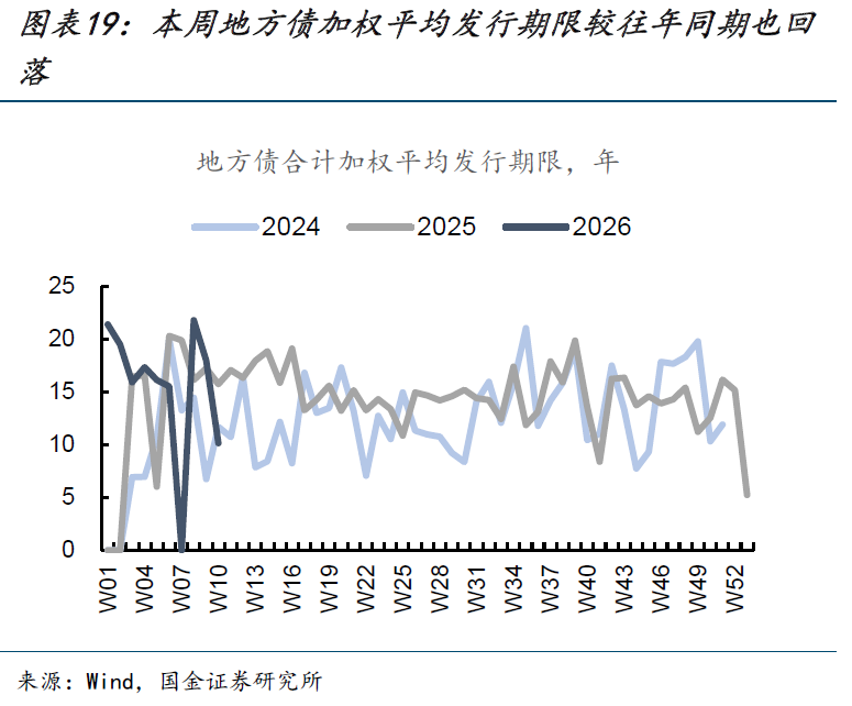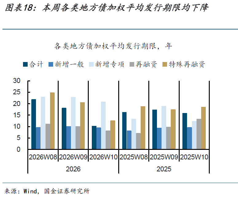 各类地方债加权平均发行期限均下降。本周各类地方债加权平均发行期限为10年,较上周的18年明显下降。其中新增一般、新增专项、普通再融资、特殊再融资加权平均发行期限分别环比下降1年、2年、2年、8年,特殊再融资的平均发行期限降幅最大。同比2025年同周来看,彼时地方债加权平均发行期限为16年,也明显高于本周。