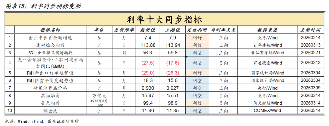 本周(3月8日至3月14日),利率十大同步指标释放的信号以“利空”为主,占比6/10;较上周的变化有:铜金比发出“利空”信号。