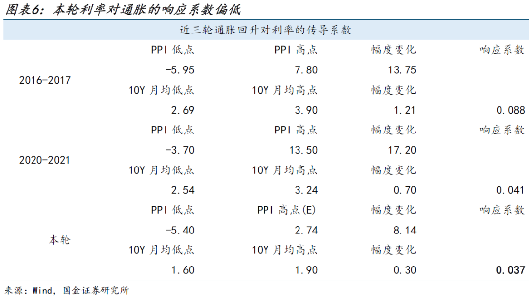 利率还主要在定价“供给冲击”场景。落实到利率定价上看,以上两种场景中,利率定价仍更接近于“供给冲击”场景。以2016-2017年、2020-2021年两轮PPI上行周期为参照,计算“PPI上行幅度—利率上行幅度”之间的传导系数,再与本轮PPI潜在上行幅度下的利率变动进行对比。结果显示,本轮利率对PPI回升的定价强度明显弱于2016-2017年和2020-2021年。这在一定程度上表明,市场当前隐含的定价更主要是按一轮偏阶段性的供给冲击来理解的。