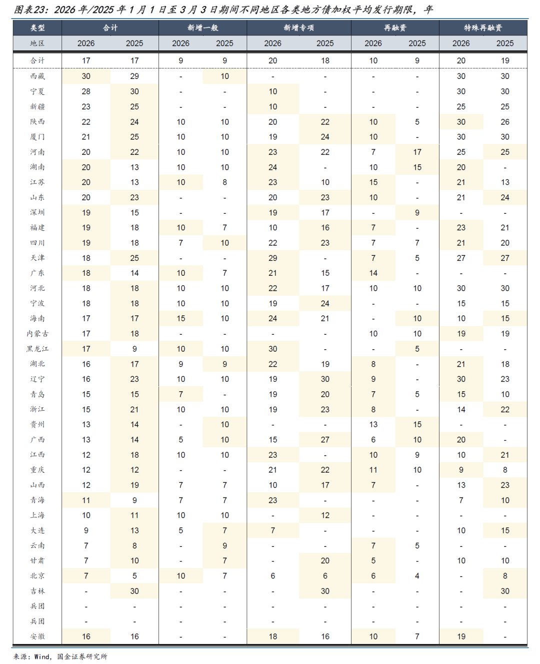 今年以来地方债加权平均发行期限与去年同期相差不大。期限方面,今年1月1日至3月13日地方债加权平均发行期限为17年、较去年同期的17年持平。其其中新增一般债平均发行期限持平于9年,新增专项债平均发行期限则上升2年至20年,普通再融资、特殊再融资发行平均期限均上升1年至10年、20年。